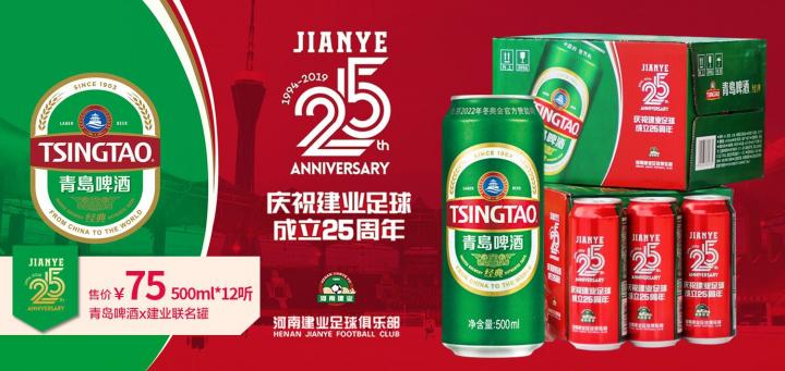 2019年9月14日,青岛啤酒&建业足球推出“建业足球25周年联名罐”新品发布会于航海体育场举行,作为亚冠、中超的“双料足球赞助商”,青岛啤酒始终与球迷一起,“建业足球25周年联名罐”的发布,标志着青岛啤酒与中超之间联系迈出了更紧密的一步。
