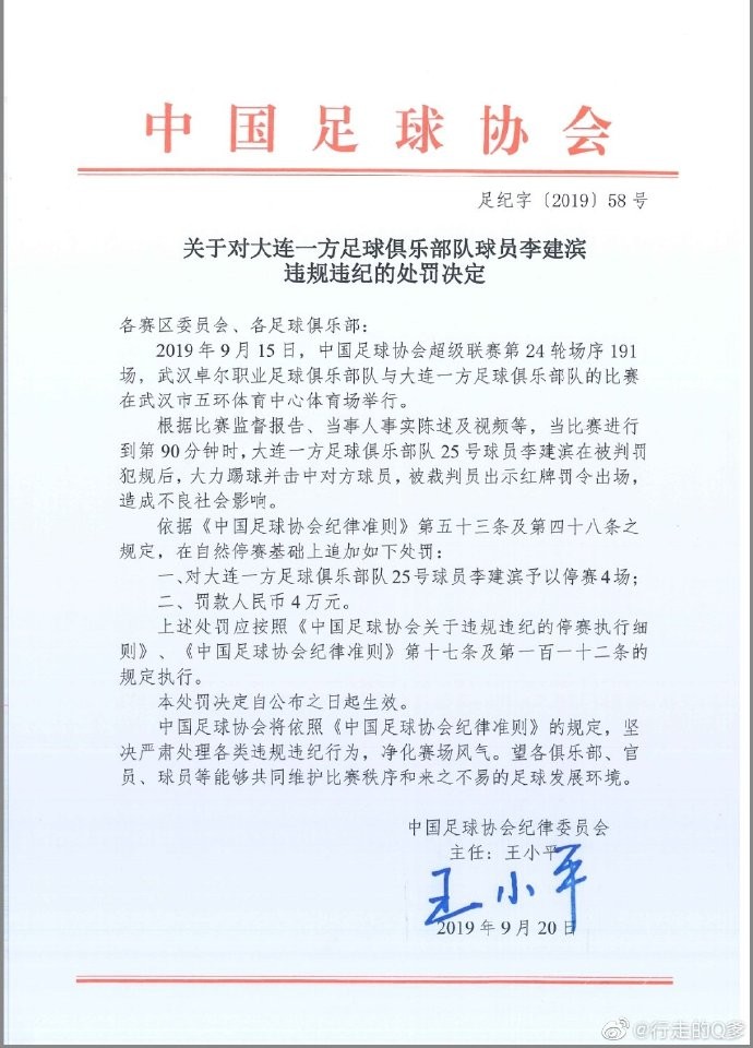 北京时间9月20日,中国足协下发了关于对大连一方球员李建滨的处罚决定:对李建滨处以追加停赛4场,罚款4万元的处罚。