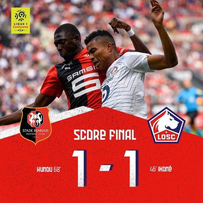 下半场比赛刚刚开始,奥斯梅恩助攻伊科内帮助里尔客场1-0领先对手! 第63分钟,金童雷纳托-桑切斯替补登场替下苏马雷!苏马雷本场比赛表现十分出色,他之前又一次左肋部踩单车过人后的内磕球帮助班巴形成一脚很有威胁的打门。第68分钟,雷恩右路传到禁区,于努头球将比分变成1-1,双方又回到了同一起跑线!第74分钟,里尔连续获得远射机会,桑切斯外围的打门被防守队员挡出,随后班巴跟上又是一脚,被对方门将神勇化解!最后阶段里尔连续做出换人调整但没能改写比分,最终双方站成1-1,里尔结束了客场比赛的三连败。
