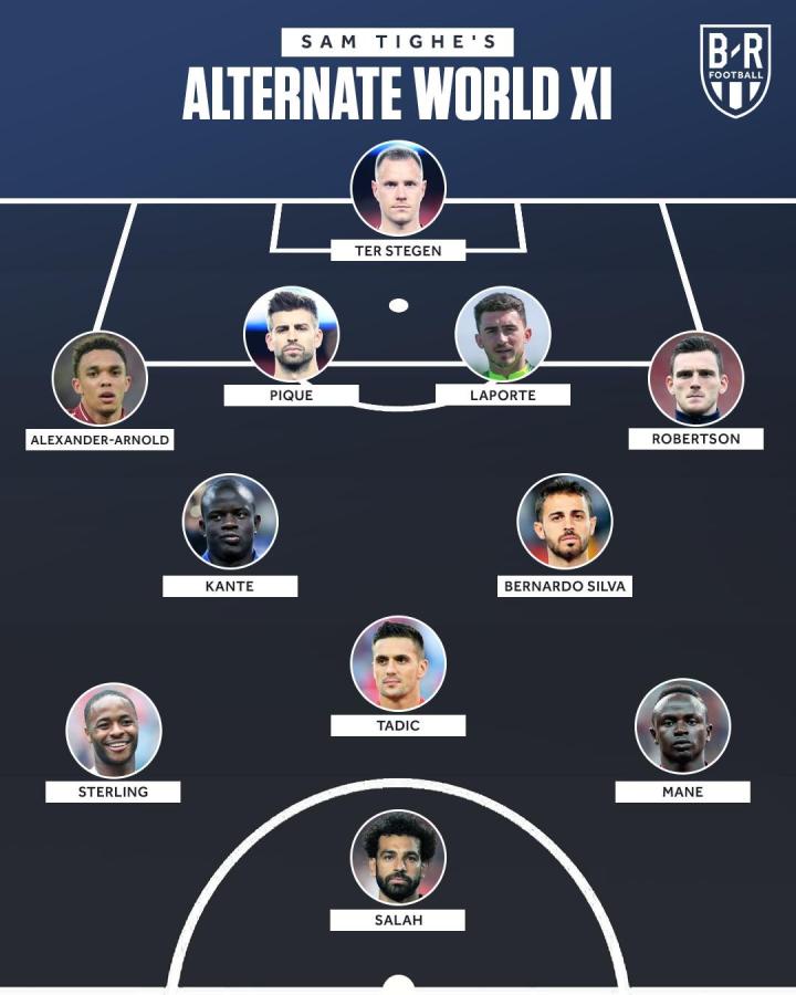 在门将位置上,巴塞罗那球员特尔施特根入围。防守线从左到右依次是阿诺德、皮克、拉波尔特以及罗伯逊。中场三人组为坎特、伯纳多-席尔瓦以及塔迪奇。在锋线位置上则是斯特林、萨拉赫以及马内。