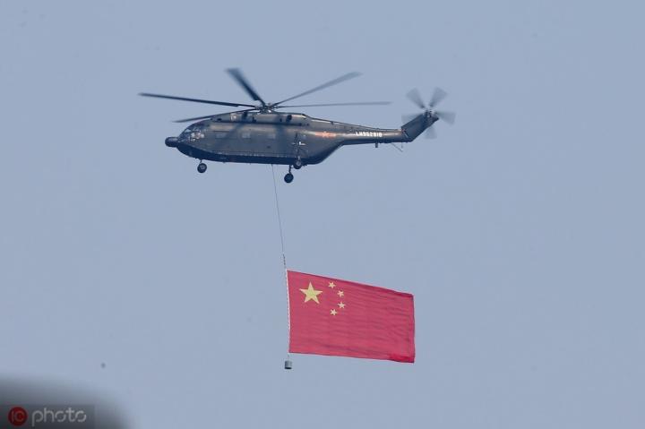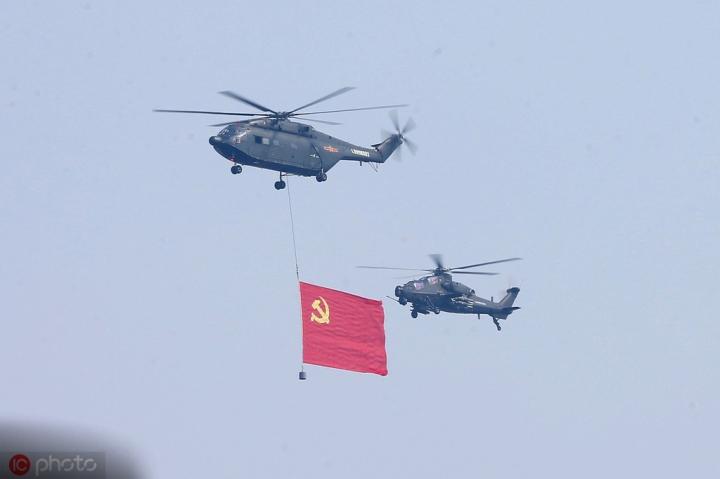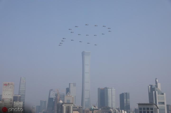 空中护旗梯队拉开了阅兵分列式的序幕,中国共产党党旗、中华人民共和国国旗、中国人民解放军军旗飘扬在天安门广场上空,20架直升机组成巨大的“70”字样。