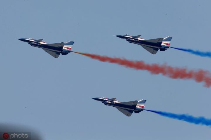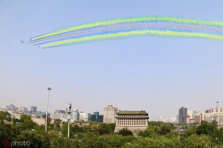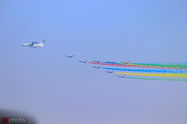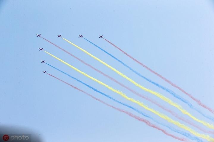 空中方队惊艳亮相,天空中飘起七道彩烟。