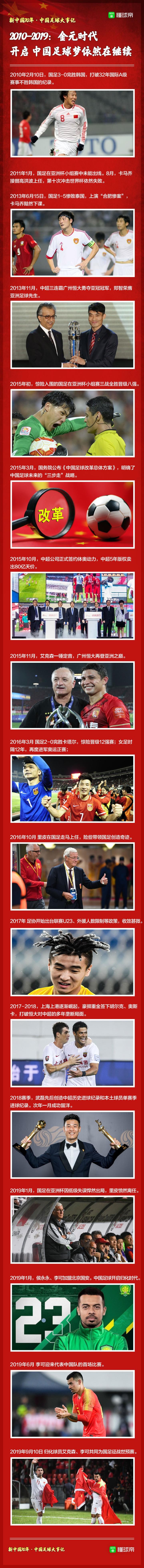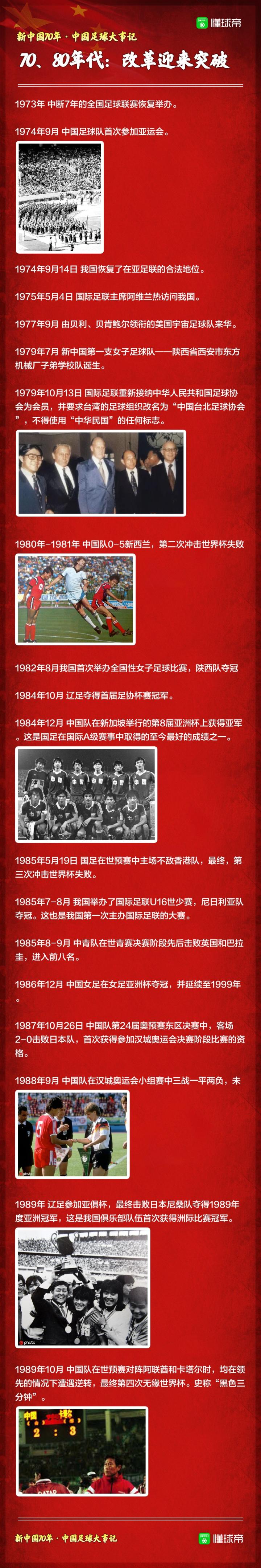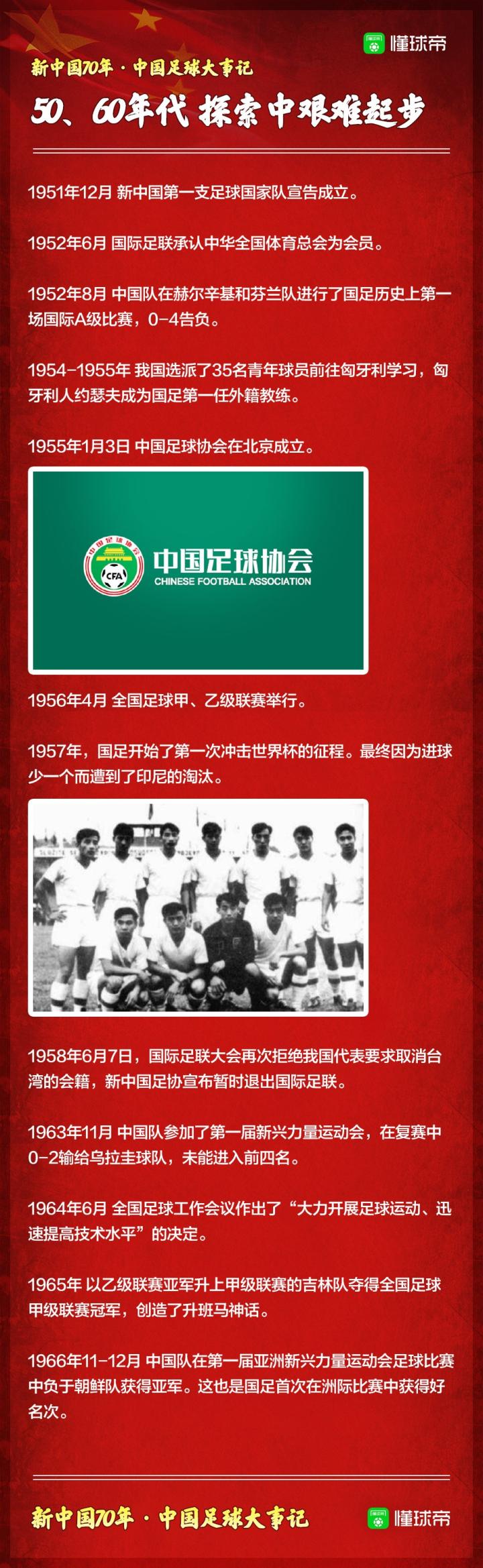 新中国足球70年大事记 懂球帝图说 2019-10-01 13:00新中国成立后,中国足球也伴随着体育事业的发展从探索中起步,一代代足球人为了中国足球的发展,和“冲出亚洲、走向世界”的梦想不懈努力着。在庆祝新中国成立70周年之际,我们一起来回顾新中国成立以来,中国足球的那些大事件。展开更多