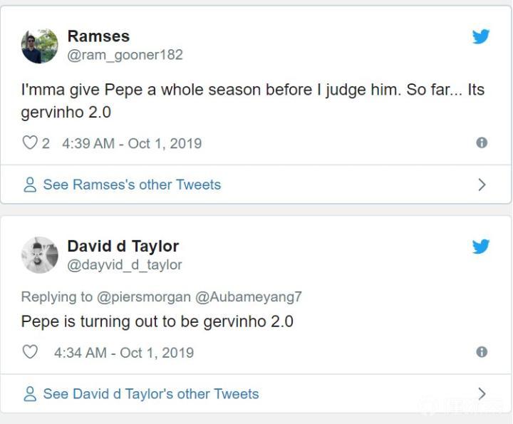 据英媒报道,在阿森纳1-1战平曼联的比赛之后,有球迷在社交媒体上将佩佩的表现,与前阿森纳球员热尔维尼奥联系到了一起。