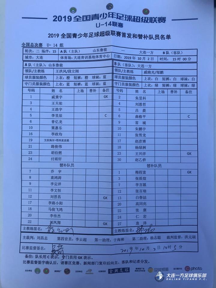 10月2日15:00,2019全国青少年足球超级联赛(U-14组)全国总决赛小组赛第二轮在大连青少年足球训练基地继续进行,大连一方U14队对阵山东鲁能U14队。上半场曲格平利用任意球破门为大连一方首开记录,常城累计两黄离场,下半场曲格平罚进点球扩大场上比分,山东鲁能则在最后阶段连扳两球,最终大连一方2-2战平山东鲁能。