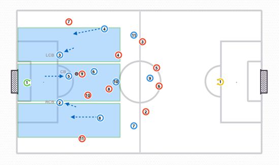 在上图中,对方前锋在禁区外的中心区域控球。中后卫立刻上前压迫。左后卫和右中后卫都快速回撤,并向内收紧,以防上前压迫的后卫被击败。此时他们打开身体,以便能够看到所有的对手,在对手转移进攻点时,也能够对危险作出反应。