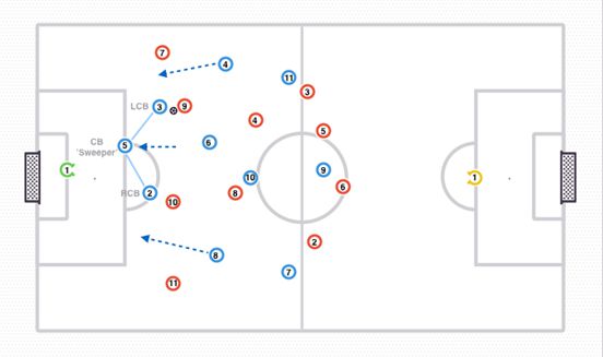 4. 如果比赛比较深入,门将可以扮演清道夫的角色,同时中后卫上前。