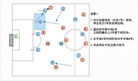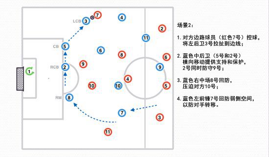 4.其余两名中后卫居中坚守。情景 2: 边前卫回撤后防线