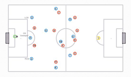 你可能听说过“清道夫门将”这个词,在3-4-3阵型中,守门员也是进攻的关键。在这个阵型中,守门员必须能够自如地使用他们的双脚,并且必须作为回传选择和后场倒球的选择。三后卫不可能像四后卫线那样覆盖整个场地宽度。因此,如果后卫线的三名球员在控球时被逼抢而不能向前传球,守门员可以提供一个传球的选择来接球并重新组织进攻。