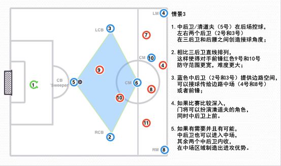 5. 如果有需要并且有可能,中后卫也可以进入中场,其余两个中后卫内收,在中场区域制造出进攻优势。