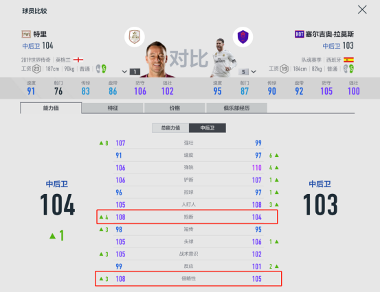 拉莫斯是现役球员中防守凶悍的代表,无论在球场上还是游戏中,想要过掉拉莫斯?看水爷一记扫堂腿把人和球一块带走。那么他和特里对比,谁更有侵略性呢。上图是特里单卡和水爷银卡的对比,可以清楚地看到特里的抢断和侵略性高于拉莫斯,在防守中特里断球更快速、更干净、更凶狠。