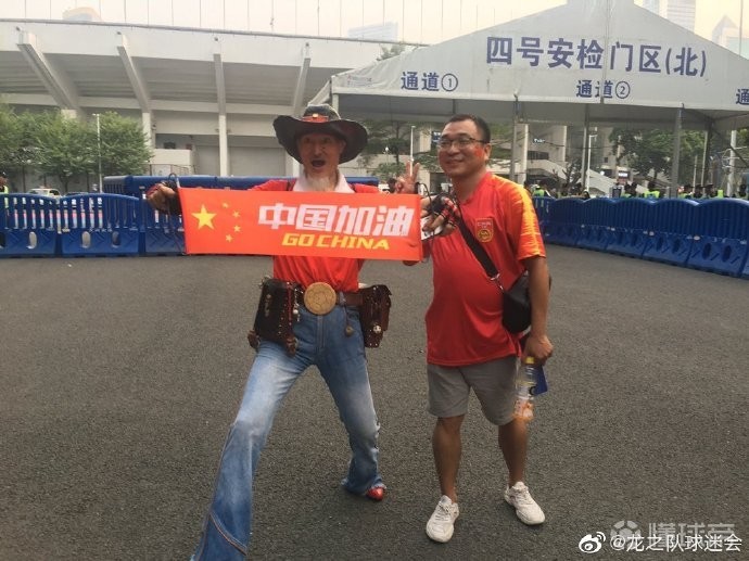 部分球迷提前来到天体为国足助威,“球迷皇帝”罗西现身