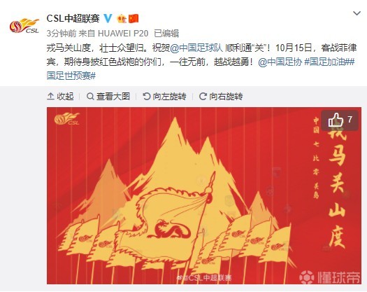 中超官微:戎马关山度,壮士众望归,祝贺国足顺利通“关”!AKunMeow @懂球帝2019-10-10 22:19北京时间10月10日20时,国足在世预赛中主场7-0大胜关岛。赛后,中超联赛在官方微博为国足送上了祝福:祝贺中国足球队顺利通“关”!图片来源:中超联赛官方微博中超联赛在其官方微博表示:“戎马关山度,壮士众望归。祝贺中国足球队顺利通‘关’!10月15日,客战菲律宾,期待身披红色战袍的你们,一往无前,越战越勇!”按照赛程,北京时间10月15日20:00,国足将在下一场世预赛中客场对阵菲律宾队。展开更多