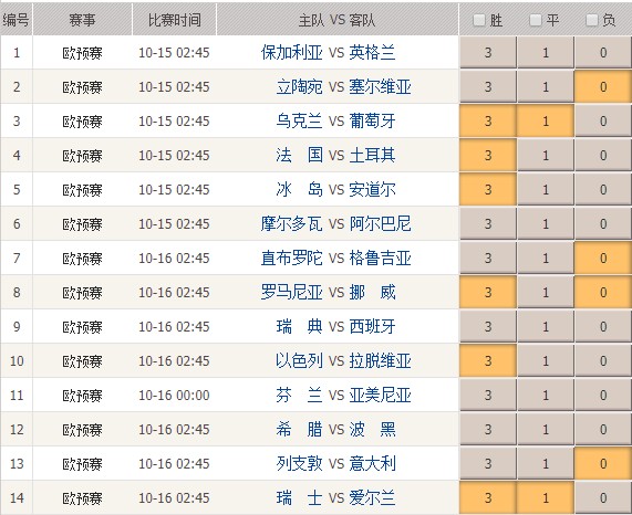 上一次给大家推荐的胜负彩第19135期是顺利的命中了任九,今天第19137期胜负彩依然是欧预赛的组合,再来给大家看看我最终所选择的九场比赛,但需要注意的是本期依然是存在多场比赛强弱分明的现象,所以最终的奖金未必会很高,大家可以选择减少一下资金的投入。希望今天的推荐能够给大家的投注提供参考和帮助。