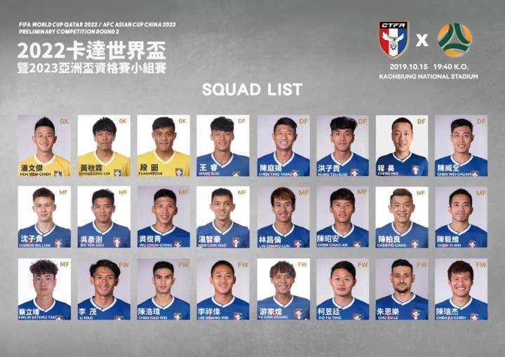北京时间10月15日,中国台北将迎来与澳大利亚世预赛40强赛的较量。赛前,中国台北大名单出炉,浙江绿城球员陈柏良、北京北体大球员温智豪在列。目前,中国台北2轮皆负,没有积分,排在B组榜尾。