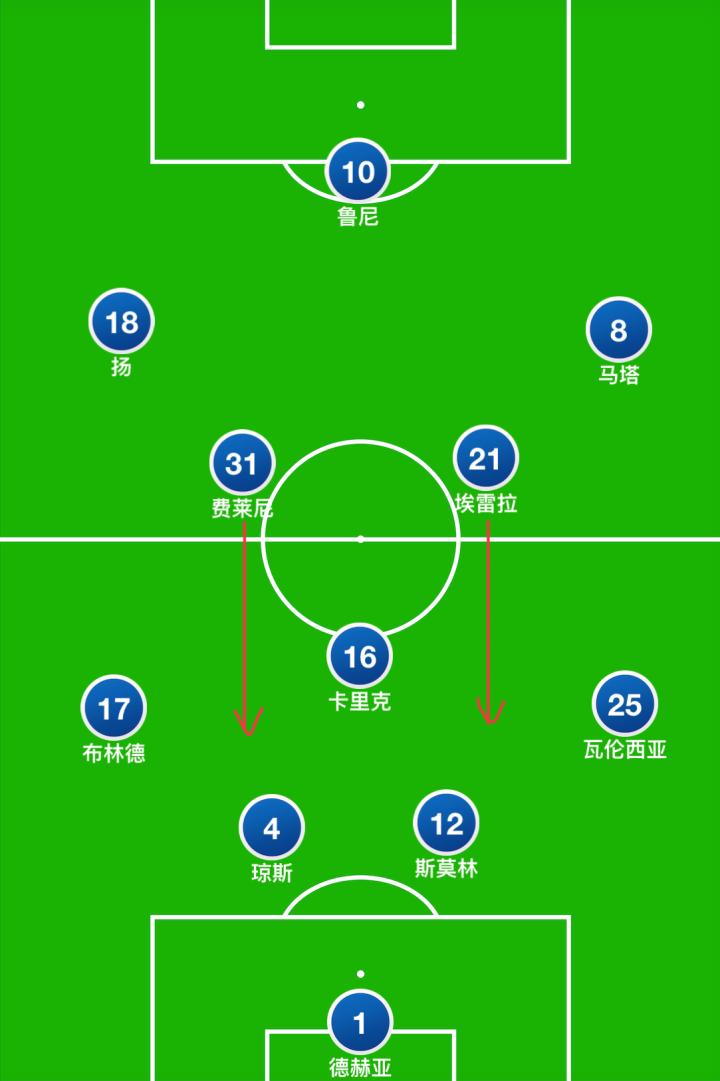 中场:马塔、贾努扎伊、卡里克、扬、埃雷拉、弗莱彻、费莱尼