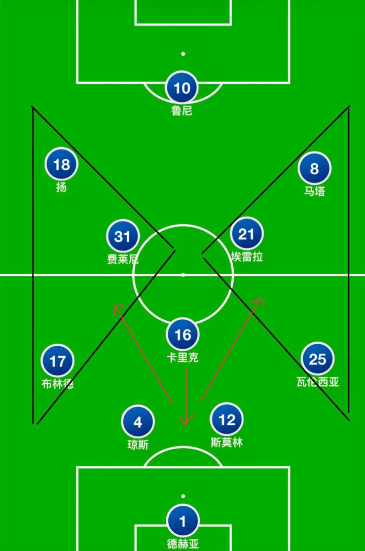 其实问题非常明显。整套阵容中,能打中场中轴线位置的球员,有马塔、卡里克、埃雷拉、弗莱彻、费莱尼,布林德算半个。可是问题在于,马塔的位置更倾向于边路,弗莱彻因为种种原因发挥不佳(冬窗离队),费莱尼又技术粗糙,埃雷拉的脚下技术也算不上多么出色,卡里克还常常在场上不见踪影。这套中场无法提供强大的中场控制力。