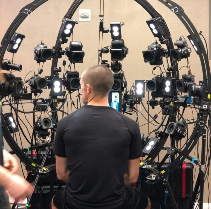 “它运行在一个同步系统上,从我们的主计算机上看,我们在同一时间启动所有的摄像头和灯光,用来获取一个180度或者更大范围的图像,聚集的点在下巴部位的附近。”