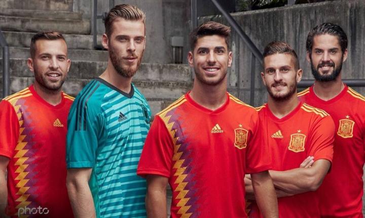 (图)西班牙队出征2018年世界杯的球衣本意是致敬1994年世界杯上的国家队,但却因看上去很像紫色的装饰而被诟病
