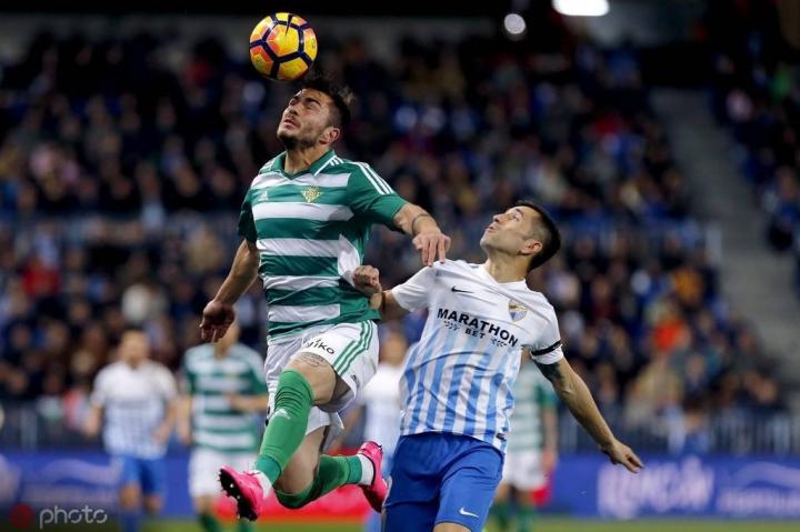 (图)在这场对阵马拉加的比赛中,贝蒂斯一改俱乐部传统的竖条纹球衣,以绿白相间的横条纹款式球衣致敬苏超豪门凯尔特人