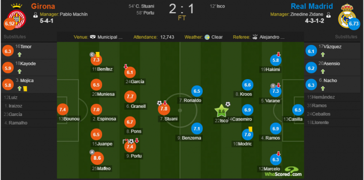 比赛开始之前被看好的无疑是皇马,彼时的西甲豪门,客场正经历着13连胜的强势,而赫罗纳开局9轮9分的成绩并不突出。虽是如此,齐达内面对这样的对手并未轻视,他还是派出了多数主力出战的阵容。