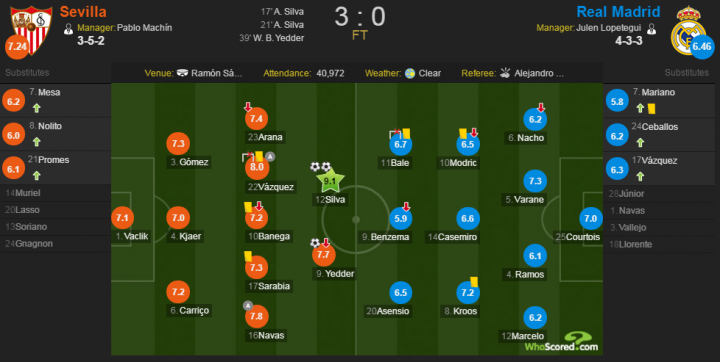 这场比赛塞维利亚延续着自己硬朗和开放的风格,开场仅30秒便由席尔瓦杀入禁区内完成一记射门。同时马钦弟子们再一次通过近乎疯狂的拼抢给皇马的出球造成了很大的麻烦,并多次获得前场定位球的机会。仅仅上半场,塞维利亚便凭借安德烈-席尔瓦的梅开二度和本耶德尔的进球取得3:0的领先,让皇马颜面扫地。而这三粒进球,可以说是各有特色,也都如教科书般经典。