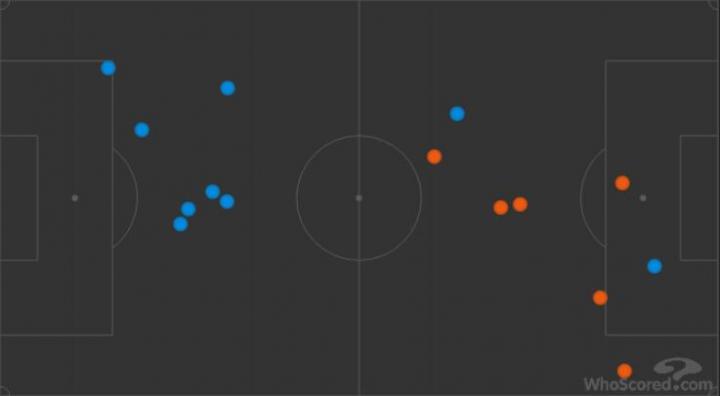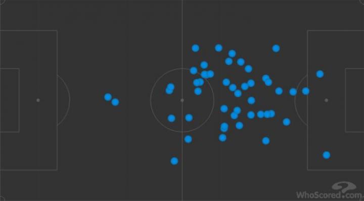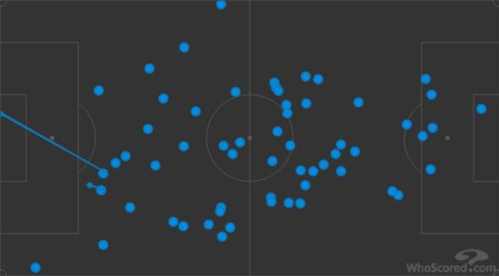 从活动区域可以看出,除了本职的后腰工作以外,布罗佐维奇本场频频前顶,到前腰位置活动。
