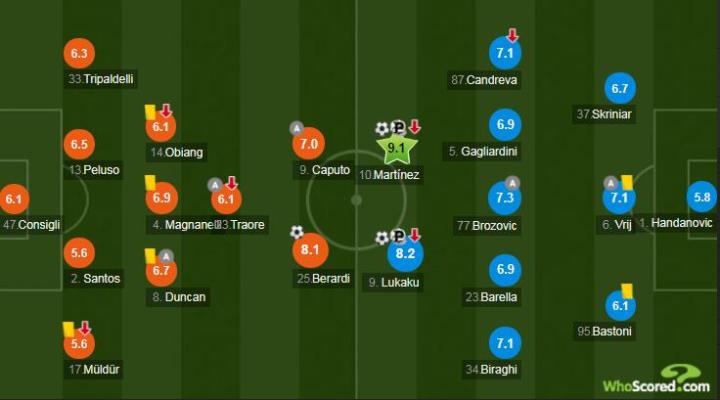 森西、桑切斯和丹布罗西奥的受伤使国际米兰本来就不够厚实的板凳深度更加捉襟见肘,加上周中将迎来与多特蒙德的欧冠生死战,所以本场孔蒂进行了部分轮换。老将戈丁和阿萨莫阿得到休息,取而代之的是巴斯托尼和比拉吉,在中场位置上,加利亚尔迪尼获得首发,锋线依然是劳塔罗搭档卢卡库。阵型352。