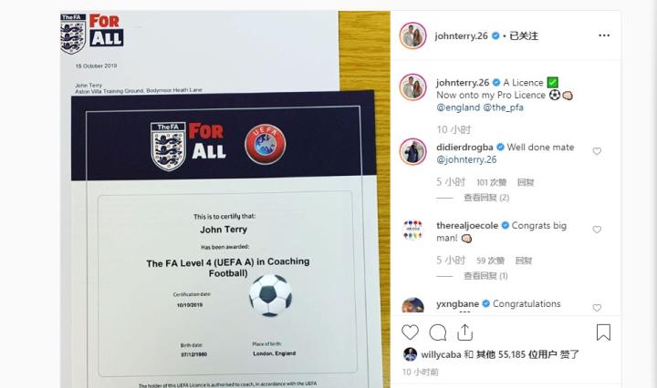 特里Ins晒欧足联A级教练证书,多位前队友送上祝贺