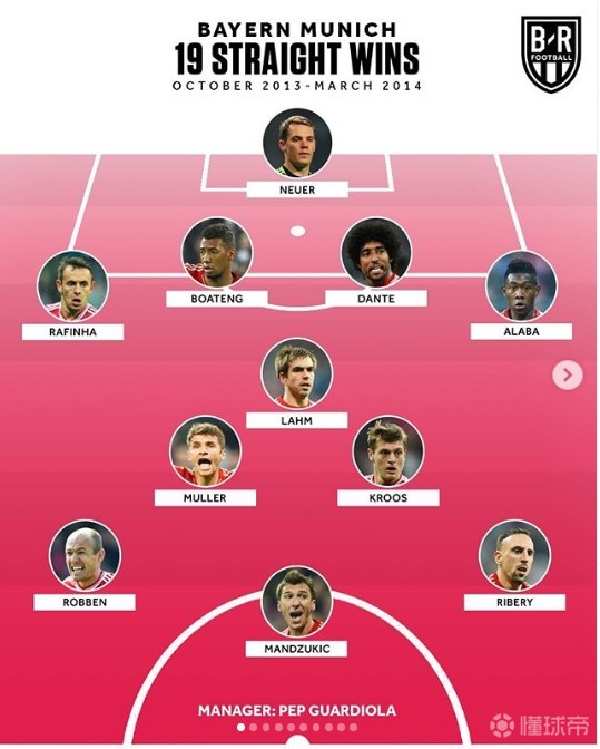 德甲巨人拜仁慕尼黑在瓜迪奥拉手下时,曾在2013年10月至2014年3月中,获得了19连胜的成绩,他们的连胜终结于霍芬海姆,那场比赛他们被对手3-3逼平。