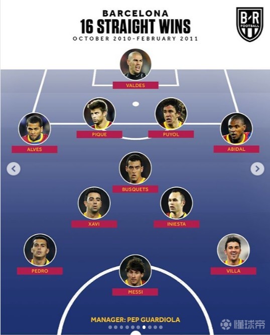 这是瓜帅的球队第三次上榜,这次换成了巴萨,彼时的巴萨从2010年10月至2011年2月期间,连胜16场,最终被希洪竞技1-1战平。
