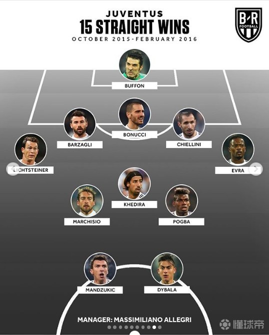 尤文图斯15连胜 教练:阿莱格里 2015年10月至2016年2月