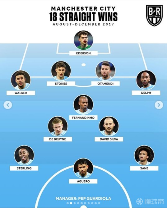 瓜帅手下的球队占据了榜单第二名,这次的球队换成了曼城。这是2017-18赛季的连胜纪录,曼城在2017年的8月至12月期间18连胜,他们的连胜纪录被水晶宫终结,当时他们0-0与对手互交白卷。