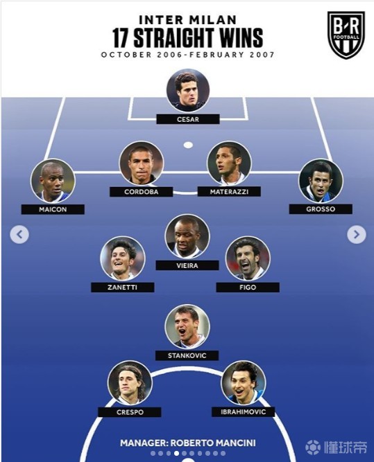 这是意甲球队最长的连胜纪录,那支在曼奇尼手下的国米在2006年10月至2007年2月间,从联赛第8轮4-1战胜利沃诺开始,直到第25轮5-2横扫卡塔尼亚,这段时期的国米摧枯拉朽般地拿下17连胜,巧合的是这段连胜的脚步从0-0闷平乌迪内斯开始,到最后也是与乌迪内斯1-1战平而结束的。