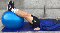 动作要领:身体平躺,将一个瑞士球垫在脚后跟下部,使小腿、膝盖和大腿成一条直线,然后快速抬起并落下脚后跟,利用瑞士球的弹性重复完成这个动作(臀肌不发力,由腘绳肌发力往下砸)。20-30s一次,3-5次。