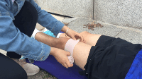 加压包扎我们采用的是螺旋形包扎法,即用下一段覆盖上一段的1/3缠绕覆盖整个大腿。一般若是场上有专业人士(队医/康复师等),他们会检查拉伤程度和具体拉伤位置,然后在痛点加压放垫片后采用麦穗式加压包扎,但考虑到普通足球爱好者没有那么专业的材料,因此我们介绍的是最简单易行的螺旋形加压包扎法。