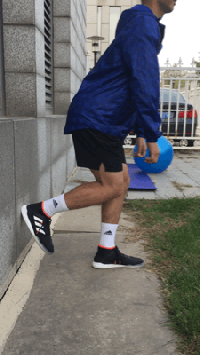 动作要领:背向墙壁站立,距离墙壁大约半步,一只脚蹬在墙上,高度大约在膝盖弯曲到90°,这条腿是为了保持平衡。另一条腿膝盖不要锁死,稍微弯曲一点,然后臀部向后坐,重复。站立腿的膝盖全程保持同样幅度的轻微弯曲,发力点是臀部和大腿后部,保持重心在脚跟以及脚掌的后半部分。