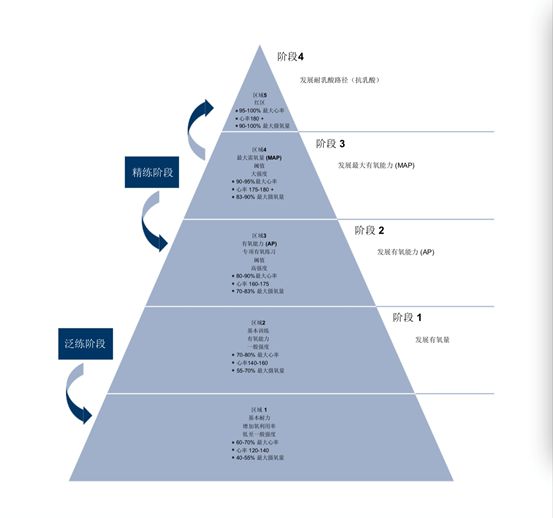 下面图表显示了不同耐力训练区域和有氧、无氧耐力训练金字塔型发展变化的各个阶段。