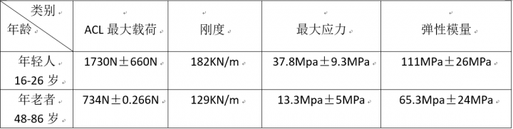 图六 年轻人与年老人的结构力学数据比较,数据来自《膝关节交叉韧带外科学》