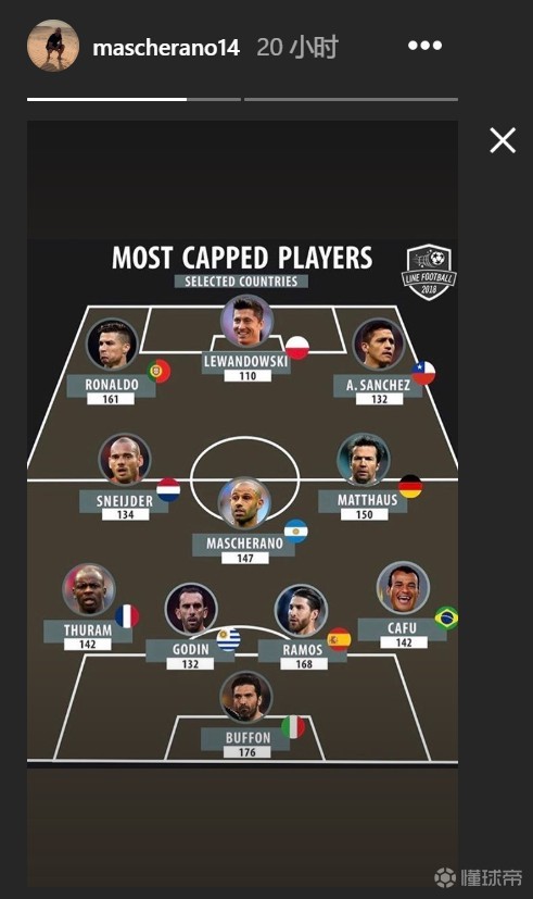 吹一波自己!马斯切拉诺分享国家队出场最多球员最佳阵