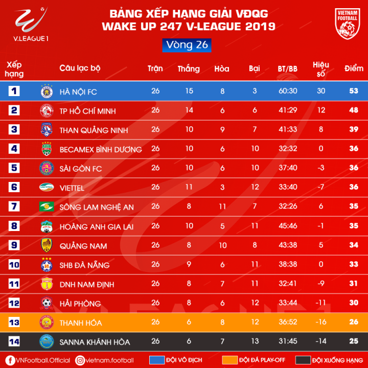 2019赛季越南足球甲级联赛最终排名已经确定,河内队获得联赛和越南杯双料冠军,胡志明市足球俱乐部获得亚军, 广宁队获得季军. 河内队获得了唯一一个代表越南参加2020年亚冠资格赛的席位. 中国球迷所熟知的平阳队排名第四. 庆和桑纳队降级. FLC清化将会参加降级附加赛.