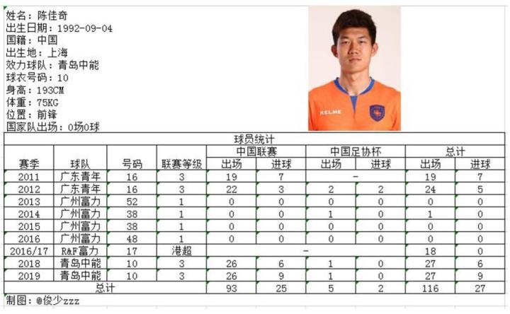 身高一米九三,不但能高空制顶,而且能脚下生风,青岛足球史上虽然也曾有过高中锋,但像陈佳奇这样科班出身、担纲主力的球员却也是凤毛麟角。陈佳奇出道于上海青训,成名于全运会赛场,曾在第十二届全运会附加赛中代表广东队一“头”将山东队拦在了决赛阶段之外。2013赛季中超联赛广州富力将陈佳奇擢升到一线队,在对阵德甲“恐龙”汉堡的中德足球友谊赛中替补登场的陈佳奇在80分钟抢点破门扳平比分成为了广州富力生涯的高峰时刻。本赛季陈佳奇为球队打入了9粒进球,是队内射手王,他还在对阵福建天信的收官战中打入一粒头球。