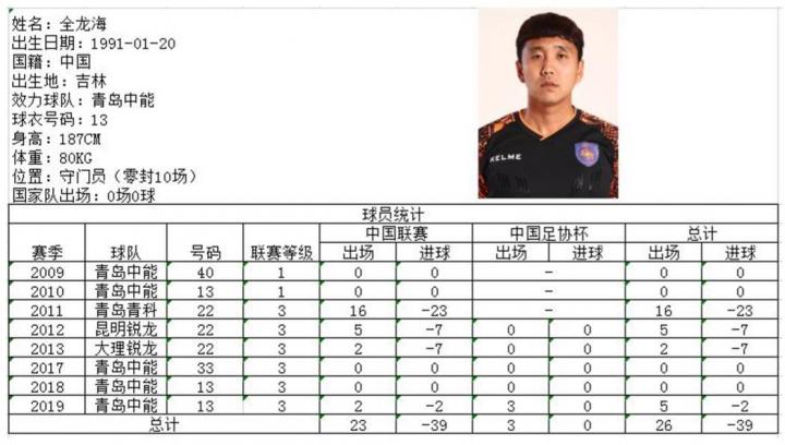 有着“旋风哥”雅称的全龙海2009赛季即被擢升一队,在2010赛季后半段曾多次入围比赛大名单。随后曾代表青科大、昆明锐龙征战中乙联赛,还曾回青加盟青岛鲲鹏。本赛季首次代表青岛中能在正式比赛登场亮相,一球不失的他更是在客战申鑫的足协杯比赛中一战封神。尽管赛季末的两场排位赛中丢了两球,但总体来讲发挥还是颇为出色。