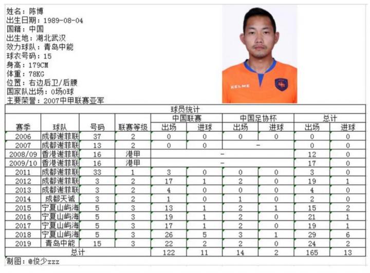 陈博不仅可以出任中后卫、边后卫,而且依靠良好的大局观以及强悍的拦截能力,还可出任后腰,他的加盟将极大补强青岛队的后防硬度。2018赛季,陈博首发26场、出场2407分钟,在完成防守重任的同时,还贡献了4粒进球2次助攻的数据,4次入选中乙联赛当轮最佳阵容。本赛季加盟中能后,担纲主力的陈博在对阵红狮和北国的比赛中打入两球,成为队史中最新一个获得进球的球员。