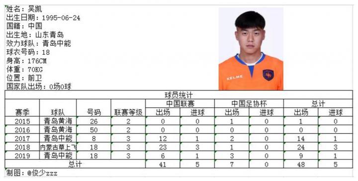 吴凯曾代表青岛中能打入了征战中乙联赛的首球:下半场开场仅7分钟比分便被改写。吴凯抓住对方后卫的传球失误,断球成功后巧射攻破牟鹏飞把守的黑龙江队大门,1:0!上赛季吴凯曾被租借加盟内蒙古草上飞,本赛季回归球队的吴凯也选择了18号球衣,在排位赛对阵福建天信的比赛中打入一球。