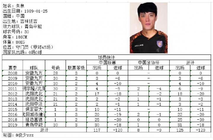 2009赛季朱泉就已经代表安徽九方征战过中甲联赛,此后跟随球队转战天津、沈阳。2018赛季,在池文一转会北京国安后,朱泉成为延边富德的主力门将,很快便在中甲赛场上证明了自己的能力和价值,帮助球队以11胜5平14负的战绩获得中甲第十。转会青岛后朱泉成为了主力门将。目前为止,朱泉把守的龙门仅丢18球在北区仅多于淄博蹴鞠,其中14场中乙比赛零封对手。