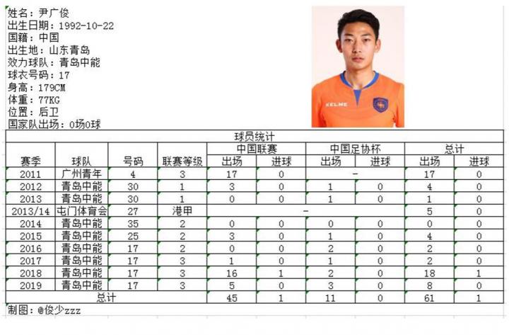 出道于广州青年的尹广俊其实是不折不扣的青岛籍球员,司职后卫的他有一脚出色的远射,曾与胡俊一起加盟香港屯门体育会。上赛季对阵陕西大秦之水的比赛中,尹广俊曾经世界波破门,同时还有多脚远射击中横梁。本赛季尹广俊多次入围比赛18人大名单,杯赛与排位赛中亦曾担任场上队长。