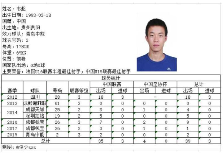 出道于成都瑞德中心,曾赴法国梅斯留学多年的韦超司职前锋,青年时期可谓星光熠熠,曾斩获法国U16联赛半程最佳射手和中国U19联赛最佳射手,2017年9月,韦超加盟葡锦标联赛蒙塔莱格里俱乐部,而他的哥哥韦健也曾代表辛特伦斯在葡萄牙杯披挂上阵。本赛季二转加盟中能的韦超仅代表球队出战2场联赛就在对阵西安大兴崇德的比赛中因伤下场,本赛季也宣告报销,相信经过冬训与球队的磨合下赛季韦超将会成为锋线奇兵。