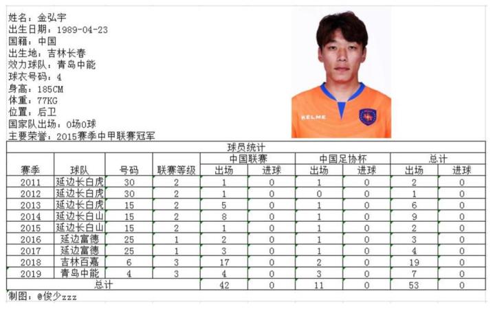成长于中国足球之乡延边的金弘宇职业生涯大多数时间效力于家乡球队延边富德,曾作为昆明海埂冬季足球集训的80后代表接受了中央电视台《足球之夜》的采访,本赛季加盟中能队的金弘宇主要担纲杯赛主力,排位赛中亦有出场,发挥稳定。