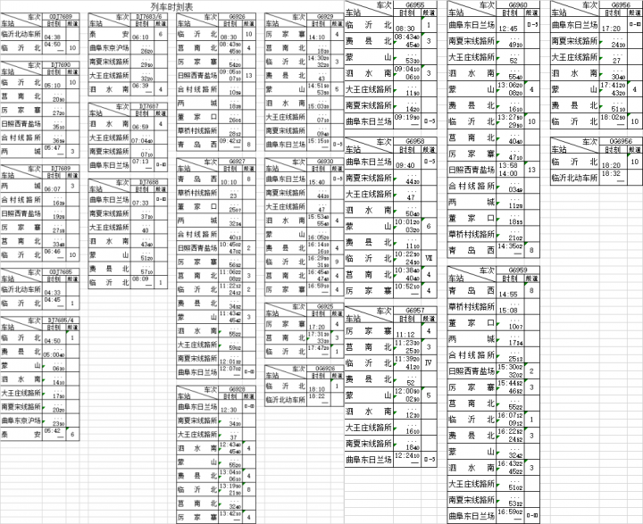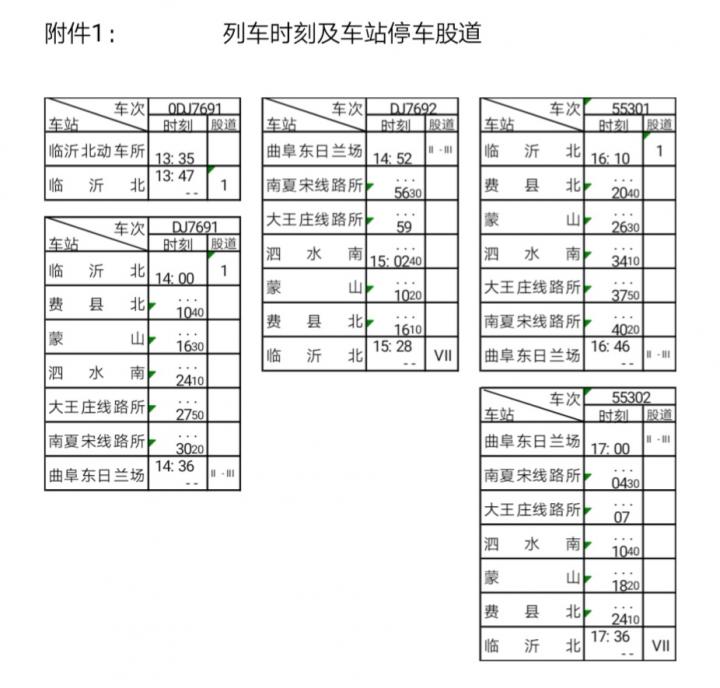 (11月8日运行试验所采用的的运行时刻表,这一表中的曲阜东一站直达临沂北耗时约36分钟)